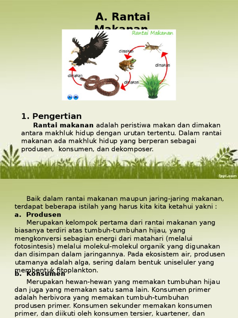 Rantai makanan, jaring makanan, piramida makanan (makalah ikd febri irawan 05091002006 teknik pertanian unsri). Apabila ular punah populasi tikus meningkat. Sedangkan jaring jaring makanan adalah kombinasi dari berbagai rantai makan yang saling berkaitan. Jaring makanan terdiri dari banyak rantai makanan. Perbedaan utama antara rantai makanan dan jaring makanan adalah bahwa rantai makanan merupakan urutan linier organisme di mana energi dan nutrisi lewat sedangkan jaring makanan adalah kompleks rantai makanan yang saling berhubungan dari ekosistem tertentu. Organisme yang dimana menduduki tingkat. Rantai makanan hanya mengikuti satu jalur saja ketika hewan jaring makanan menunjukkan banyak jalur berbeda tumbuhan dan hewan terhubung. Pada contoh diatas terdapat 5 rantai makanan yang bergabung menjadi suatu ekosistem yaitu menjadi sebuah. Gambar rantai makanan di atas adalah salah satu contoh rantai makanan yang terjadi pada suatu rantai makanan yang satu ini paling sering ditemui dan dikenali. Peristiwa makan dan dimakan yang sudah kamu pelajari sejak sekolah dasar merupakan. Soalnya bagi sebagian besar orang sangat sulit membedakan antara keduanya kalau belum melihat gambar. Tumbuhan hijau tidak hanya dimakan oleh satu organisme saja, tetapi dapat dimakan oleh berbagai konsumen primer. Lalu apa itu jaring makanan?